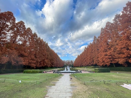 メタセコイアの並木と噴水が象徴的なエリアですが、冬季は凍結防止のため噴水は停止していました。